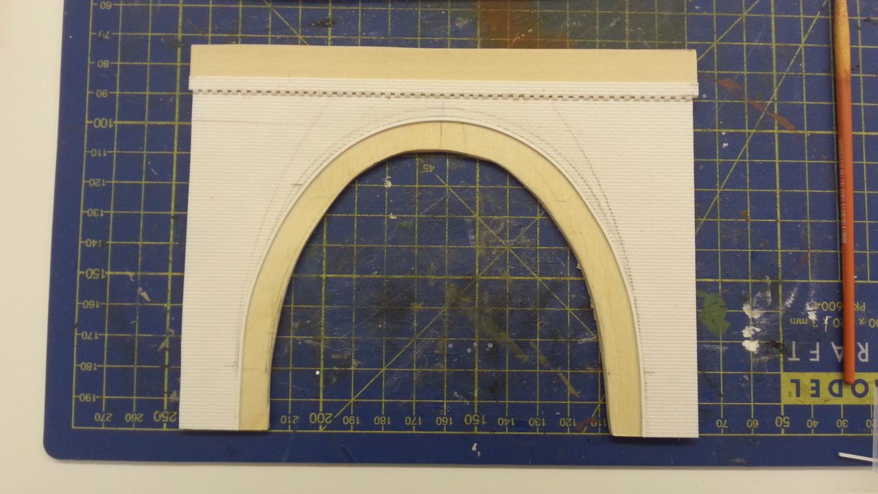 The shape of the arch was determined from a re-sized photograph. The main wall is has been made from thin ply, covered in embossed plastic card.