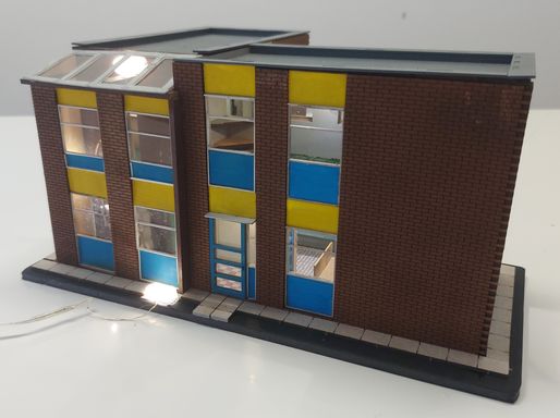 To match the Blue Circle colours, I used a bold blue & yellow scheme for the panelling, contrasted by the drab brown brick. There is full lighting inside, and most of the rooms have some furniture.